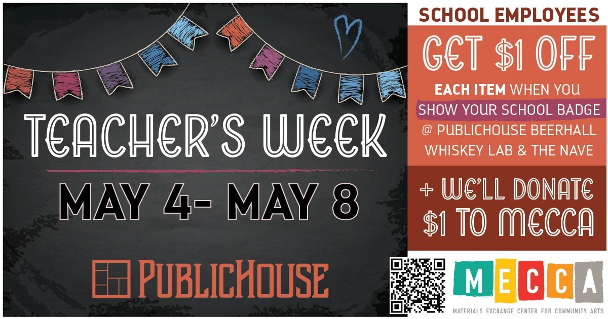 From May 4-8, any school employee who shows their school badge at The BeerHall, Whiskey Lab or The Nave Kitchen will receive: